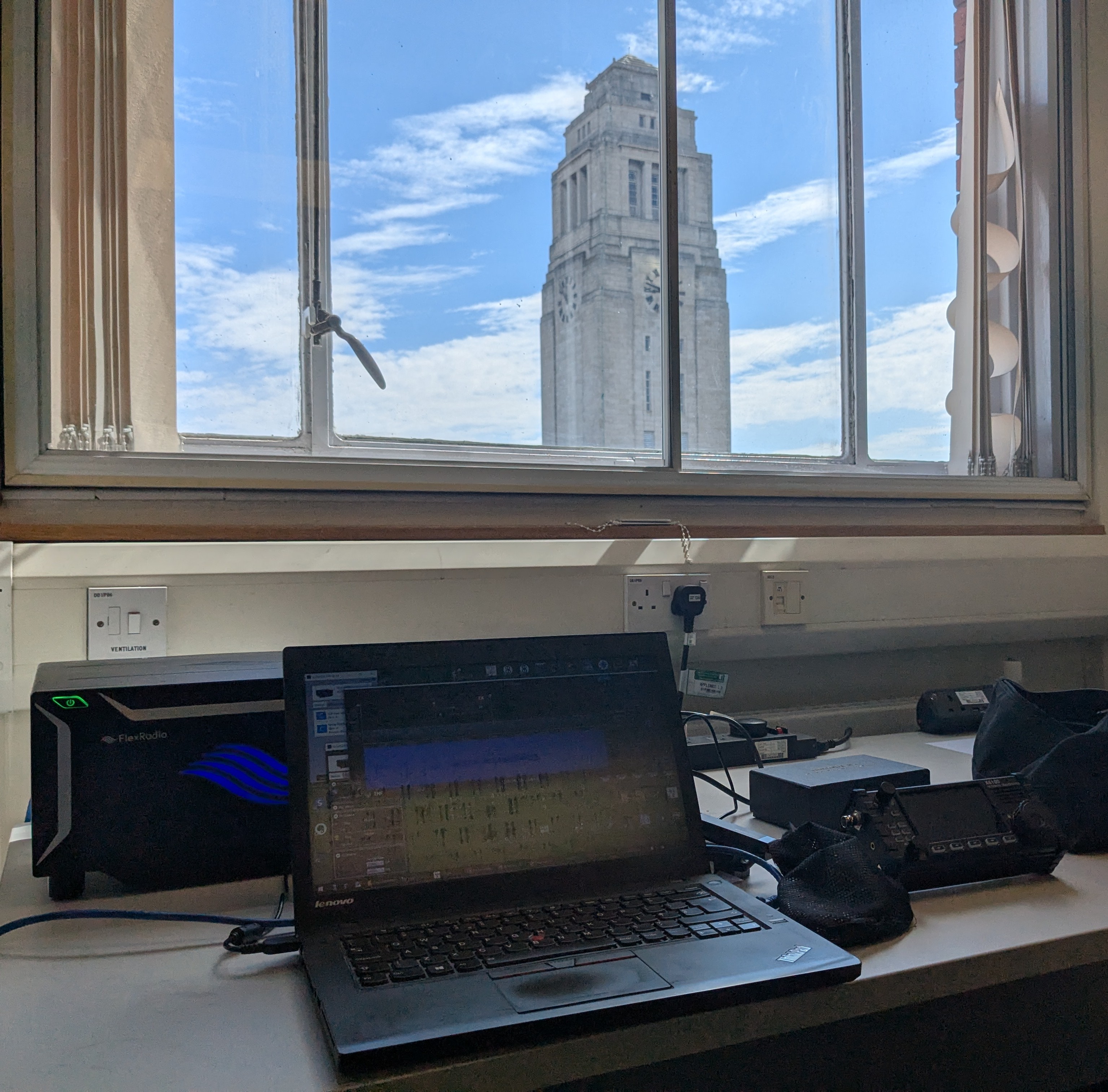 We have now completed the first phase of the project, which is to set up the computation and communication infrastructure to produce the dataset we’ll use to train the machine learning models with. First, I installed a multi-band HF antenna on the roof of one of the University of Leeds buildings, which was a complex endeavour by itself given all the building conservation and health-and-safety regulations, and the amount of electromagnetic noise generated by the building management, air‑conditioning, and wireless systems. Then, I set up a SDR transceiver that covers the entire HF spectrum and can be controlled by an external computer.