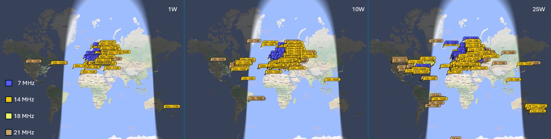 Over the course of his first year as a PhD student, Miguel managed to produce the typical literature review that every first year PhD student must go through to establish what’s the latest research in the area of their thesis, and to develop the software infrastructure that would automatically control the SDR (choose frequency, set transmission power, tune the antenna, control transmission and reception), gather channel traffic data before a transmission (by decoding signals received from the SDR) and also reception reports produced world-wide by other stations that could decode messages out of our transmissions (sent over the internet). For several months now, we have captured pre-transmission traffic and reception reports for our transmissions, which happen multiple times a day, at all hours, over four different parts of the HF spectrum (7 MHz, 14 MHz, 18 MHz and 21 MHz), and at three different levels of transmission power (1W, 10W and 25W). The figures below show on a map the reception reports we receive from stations all over the world that have received our transmissions over a 24h period. Different colours represent the different transmission frequencies, that have distinct propagation patterns and ranges. The different figures represent the reports received at different levels of transmission power.
